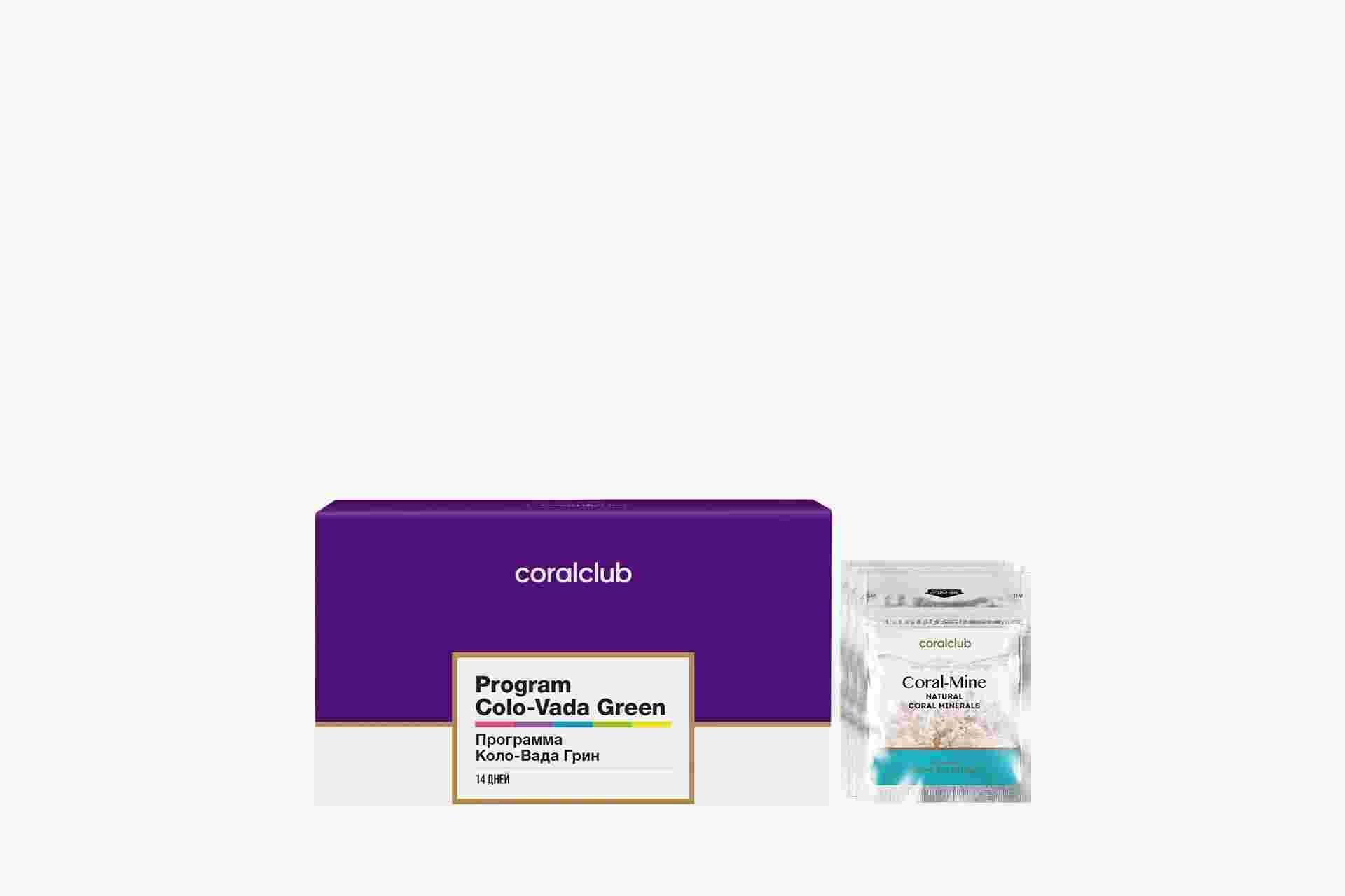 Организмди эң эффективдүү тазалоо жана метаболизмди оптималдаштыруу үчүн Colo-Vada Green программасынын жана Корал-Майн минералдык курамынын топтому.